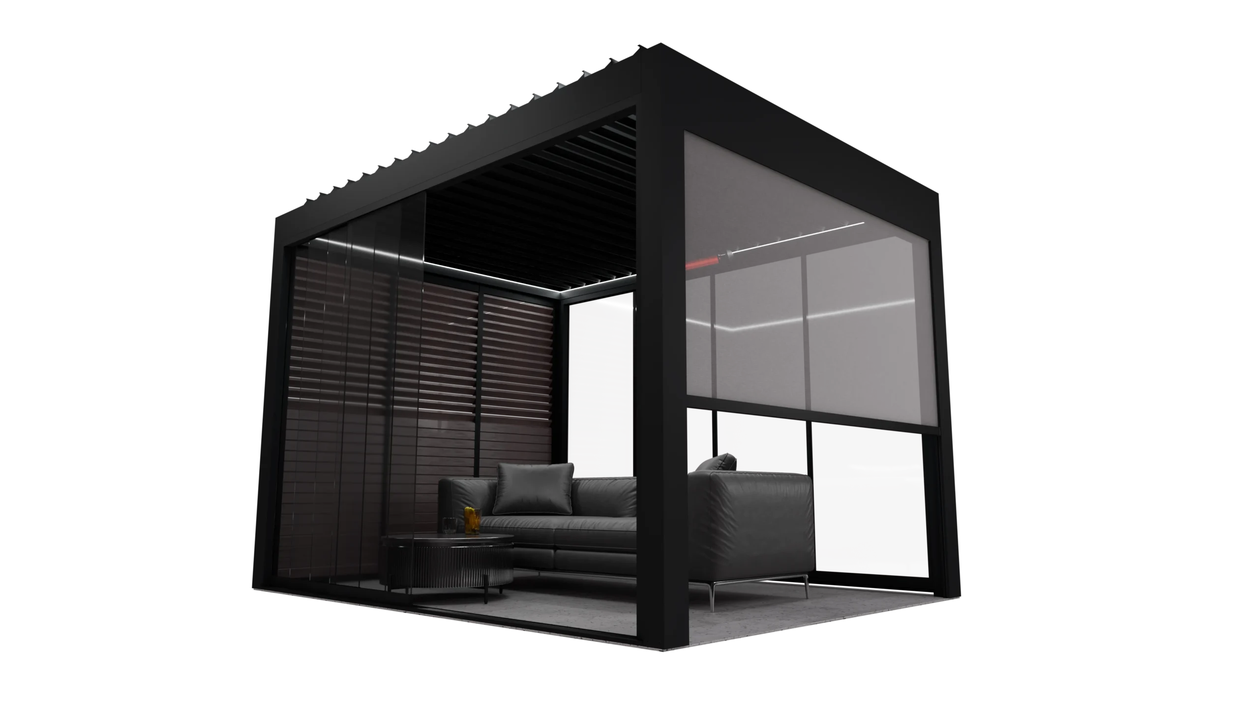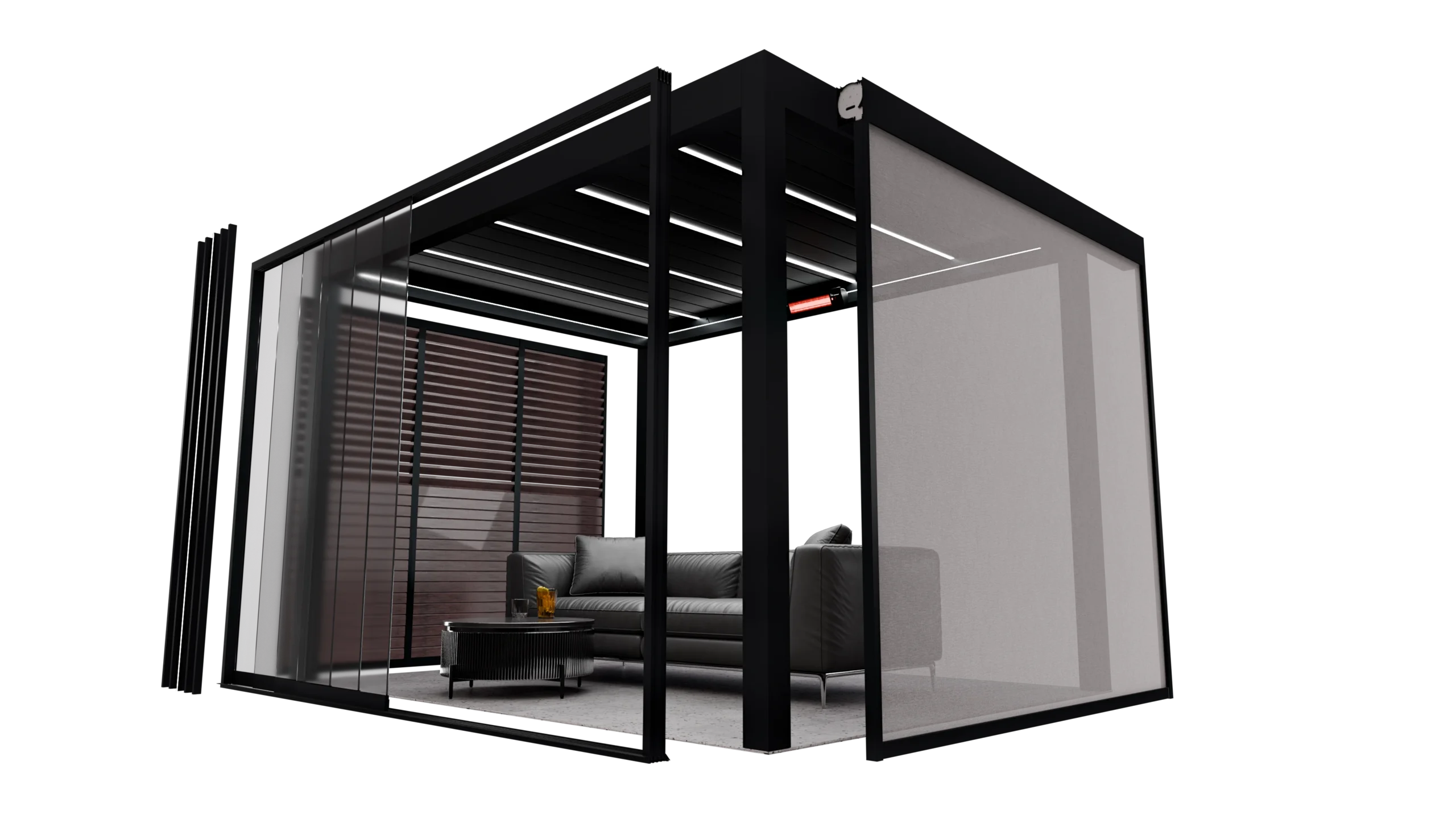 Die Spot-Beleuchtung in der Pergolenkronen ist eine hervorragende visuelle Ergänzung zur Konstruktion der Pergola ohne seitliche Abdeckungen, die über die Fernbedienung der Pergola gesteuert werden kann.