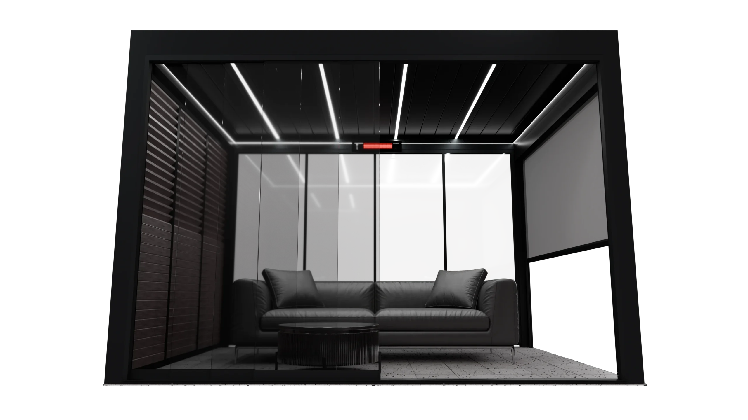 Dank der innovativen Pergolakonstruktion und der zweikammerigen Rinne ist die Montage eines Heizstrahlers direkt an der Pergolakonstruktion möglich, in Kombination mit den Außenrollos WIN SCREEN oder dem Schiebesystem aus gehärtetem Glas WIN GLASS. Die Elektrokabel des Heizstrahlers sind in einer speziellen Kammer des Hauptkopfteils verborgen, was die Installation vor äußeren Einflüssen wie Regen oder Schnee schützt.
