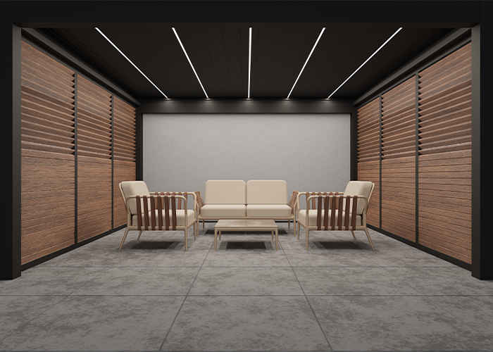 Das umfangreichste Angebot auf dem Markt für die Konfiguration der in die Pergolakonstruktion integrierten Beleuchtung ermöglicht die Auswahl der Art der Beleuchtung, der Farben, der Lichtintensität und der Lichtfarbe. Unabhängig von der gewählten Variante kann die Beleuchtung bequem über die Fernbedienung der Pergola gesteuert werden.