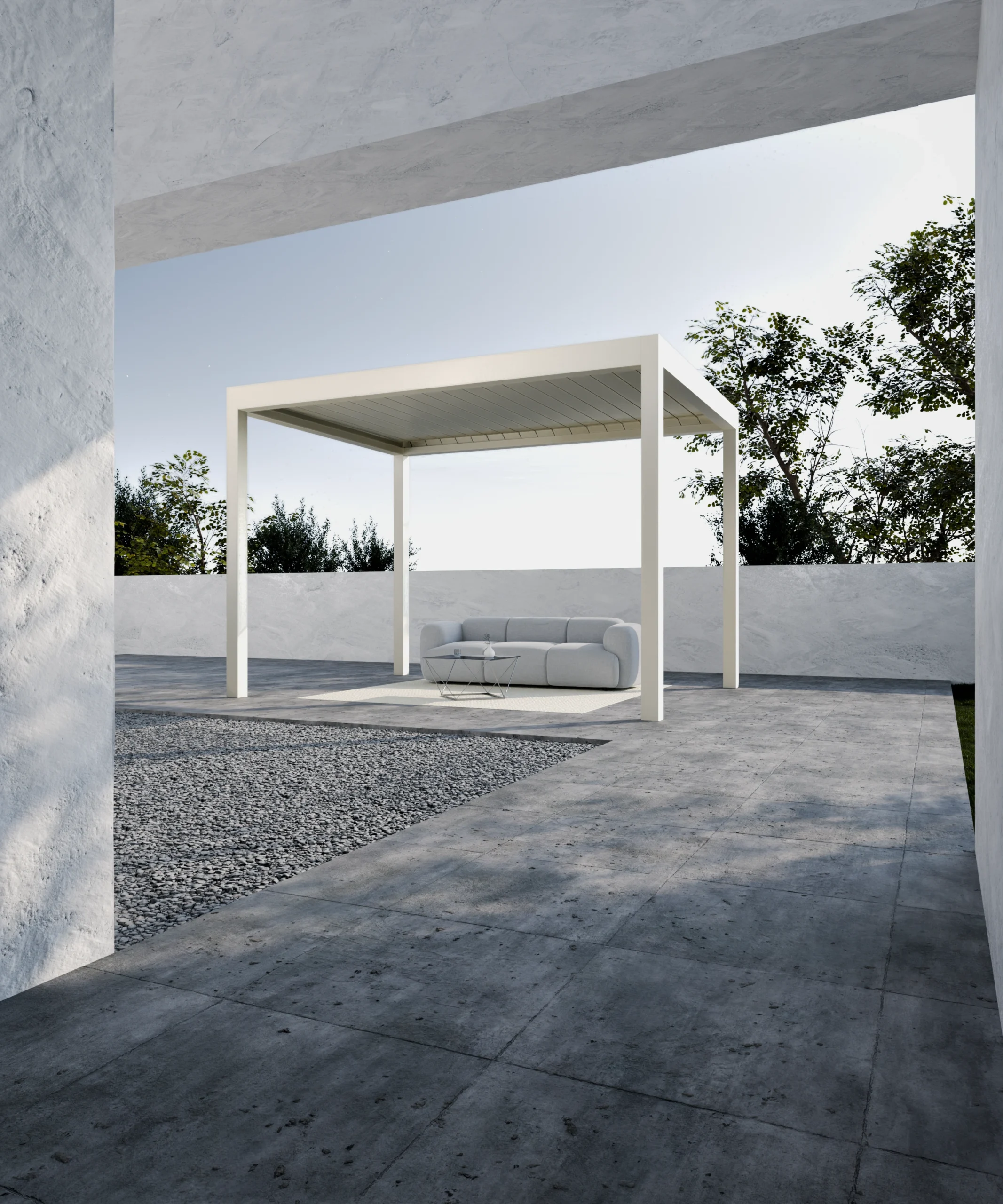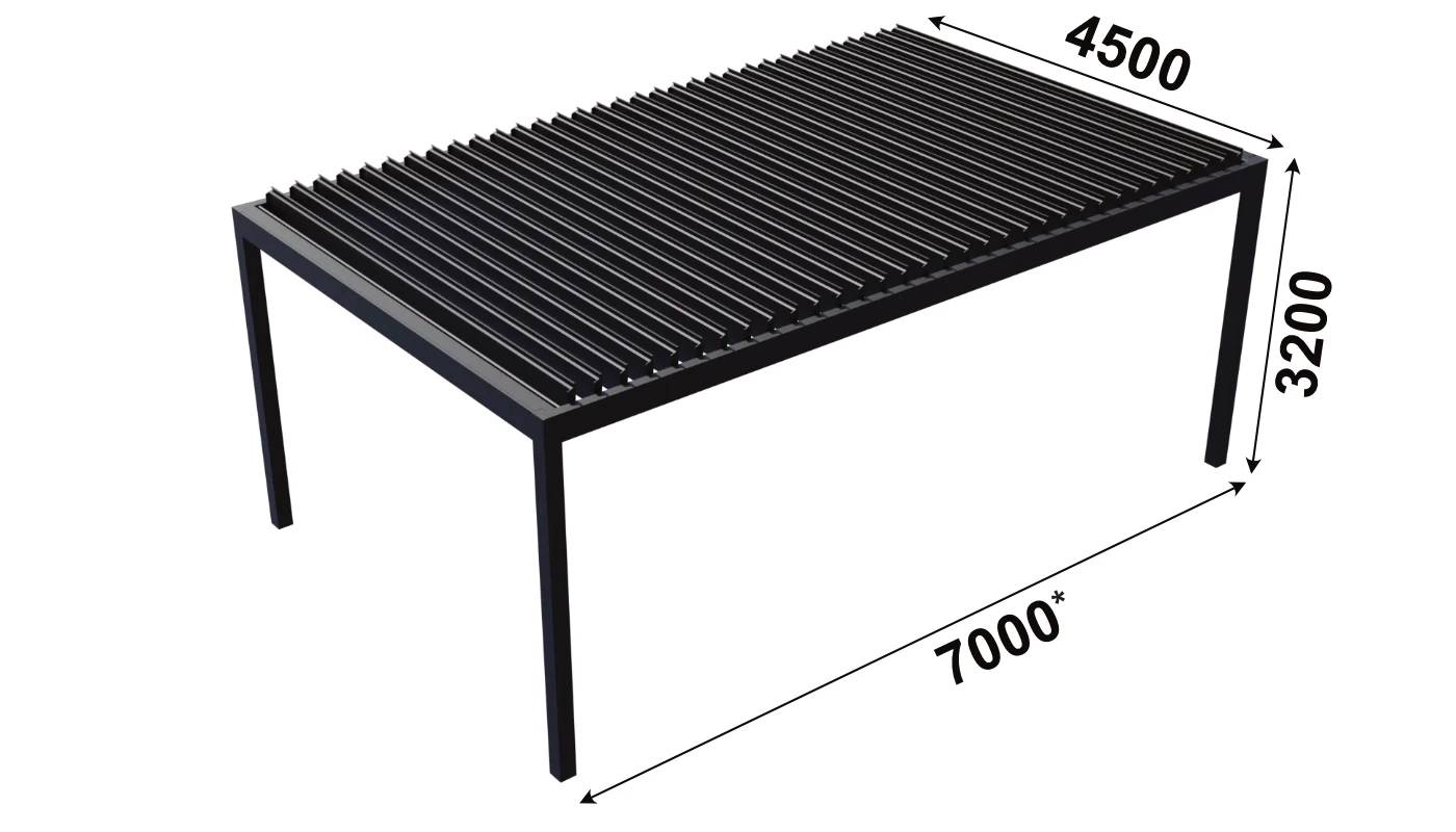 Das Dach der Pergola besteht aus Aluminiumlamellen, die von 0° bis 135° drehbar sind. Diese ermöglichen die Kontrolle über die Menge des Sonnenlichts und schützen in geschlossener Position vor übermäßiger Sonneneinstrahlung sowie vor Niederschlägen.