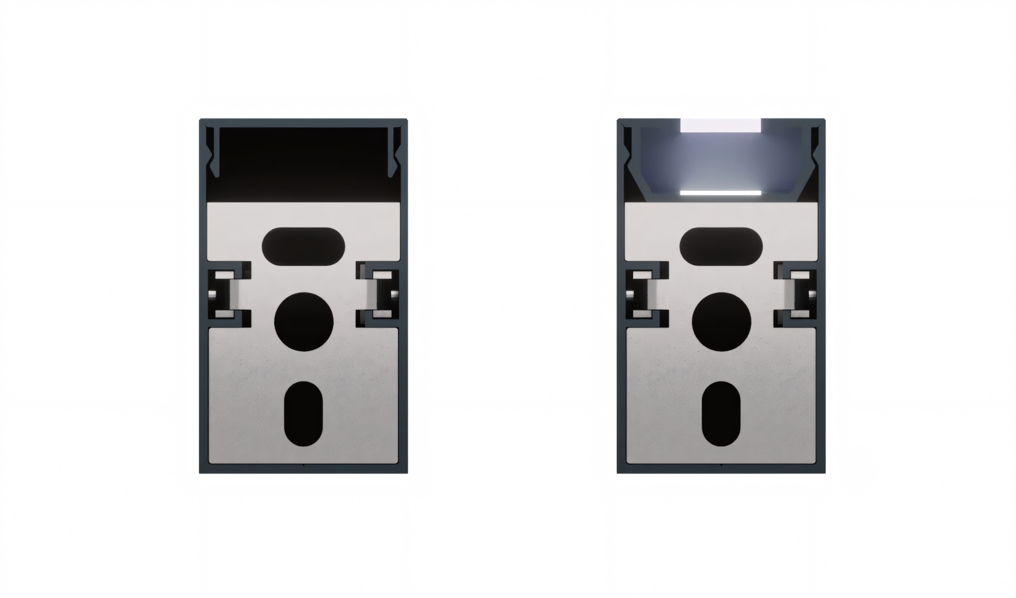 Verdeckte Kabelführung für die Beleuchtung in den Profilen (anstelle externer Lampen).