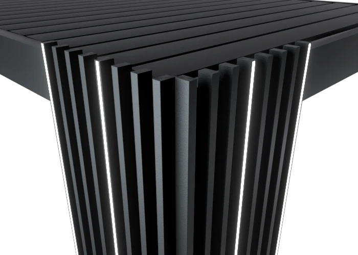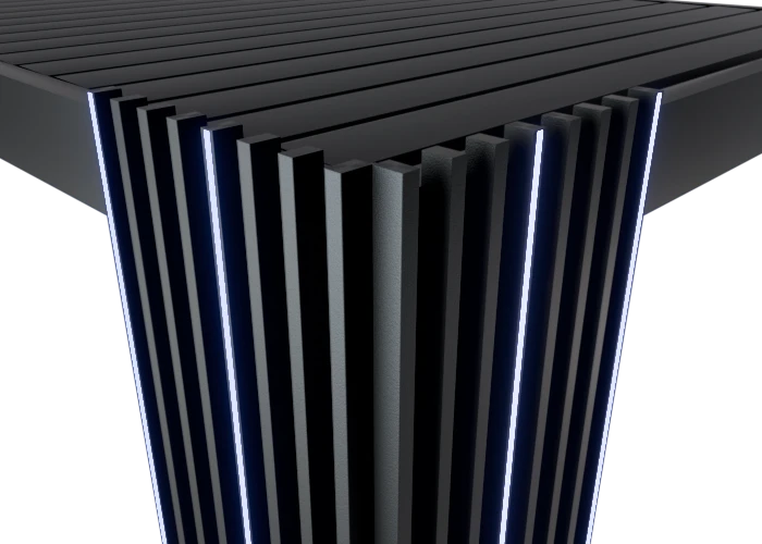 Moderne RGB-LED-Beleuchtung in den Vertikalprofilen WIN VERTO verleiht der Pergola einen einzigartigen, dynamischen Charakter und ermöglicht die Schaffung einer unverwechselbaren Atmosphäre. Innovative LED-Lamellen mit integriertem Diffusor/Blende in Schwarz oder Weiß harmonieren perfekt mit der Konstruktion und erzeugen den Effekt einer einheitlichen, durchgehenden Lichtlinie – ohne sichtbare Lichtpunkte.