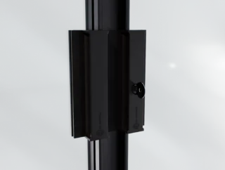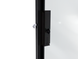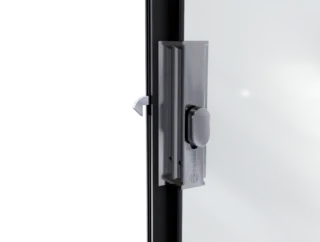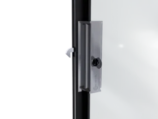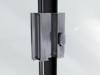 Do wariantu rozsuwania jednostronnego i dwustronnego przewidziano zamek górny z pokrętłem od strony wnętrza i kluczykiem od strony zewnętrznej. Występuje w dwóch kolorach – polerowana stal oraz czarny mat – spójnych z pochwytami. Został wykonany w formie odlewu, bez widocznych śrub łączących, co gwarantuje estetyczny wygląd i solidność.