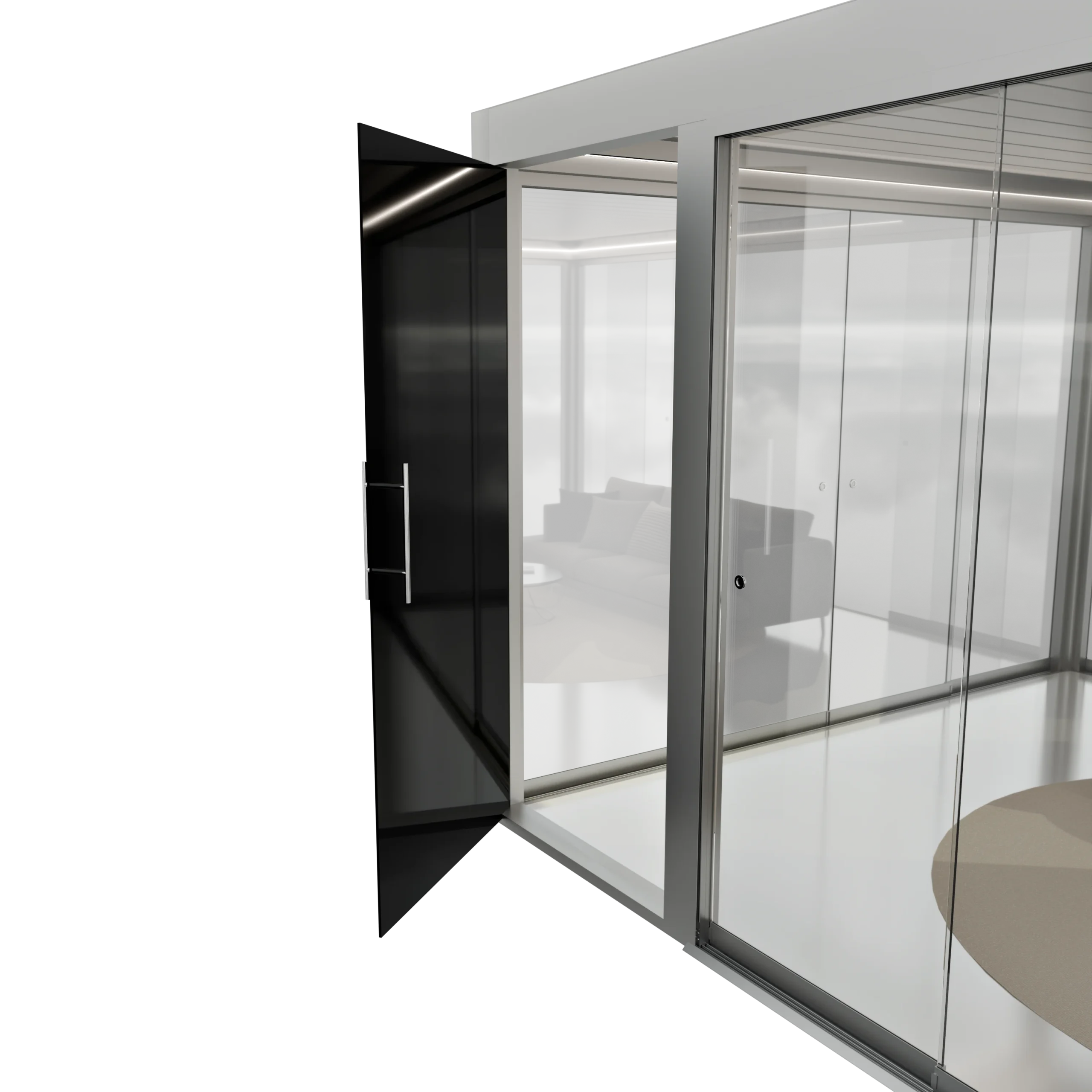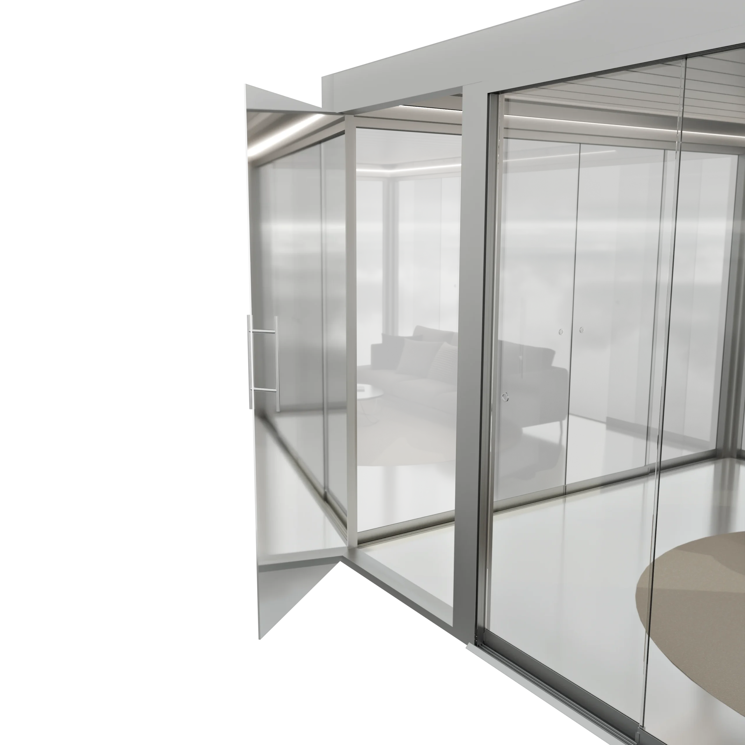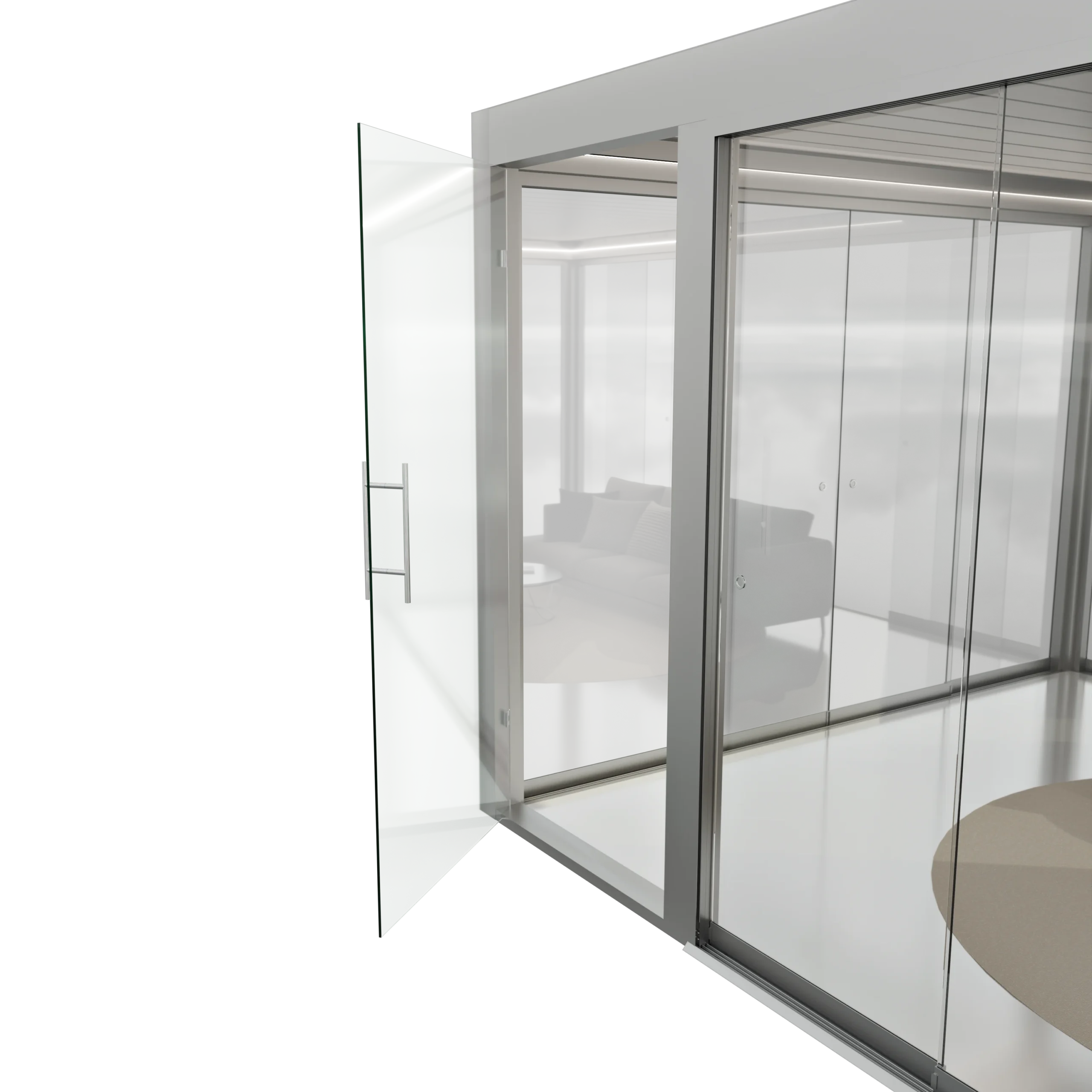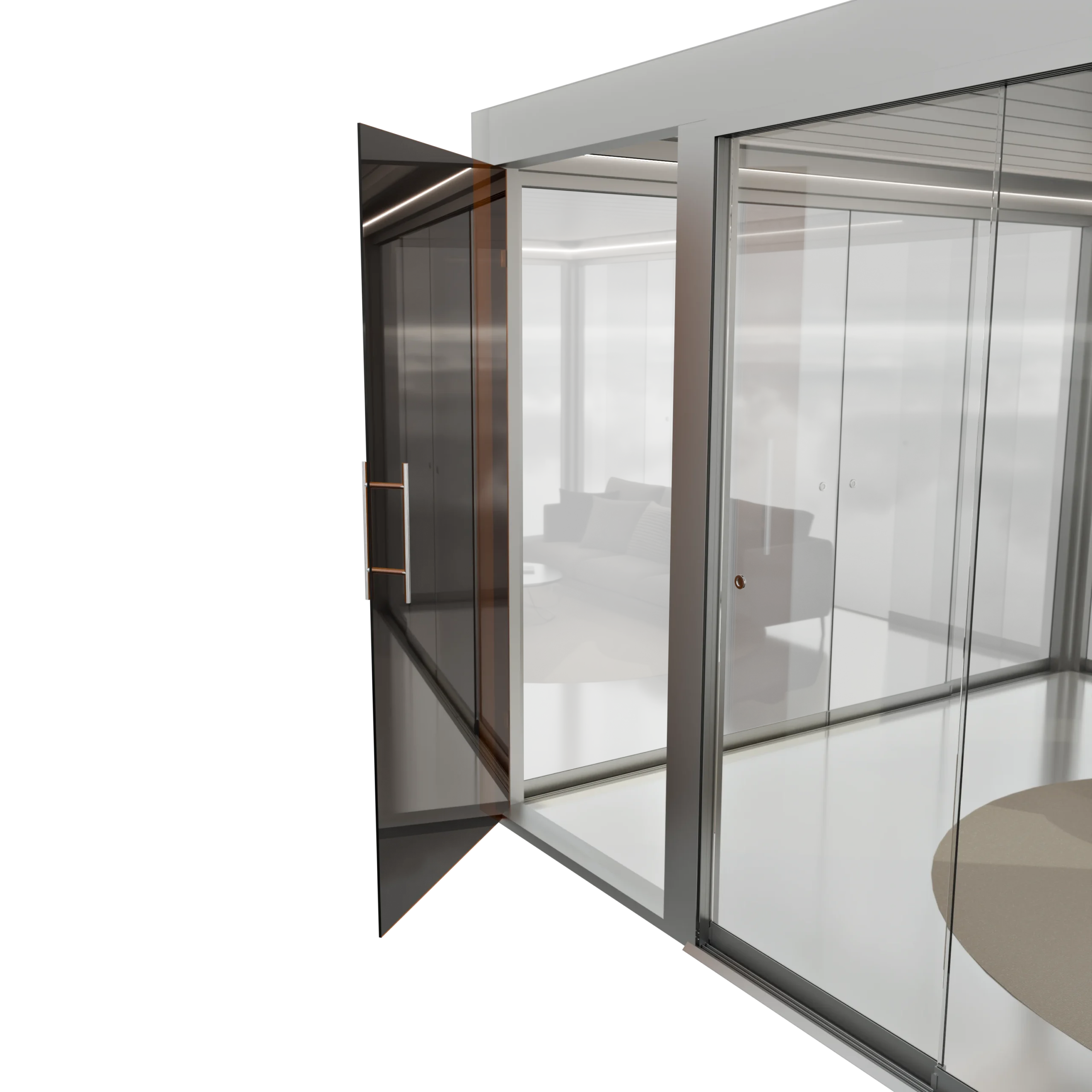 Połączenie narożne pozwala uzyskać pełne otwarcie przestrzeni – tafle szkła przesuwają się w obu kierunkach, tworząc efekt całkowitego otwarcia narożnika bez widocznych słupków.