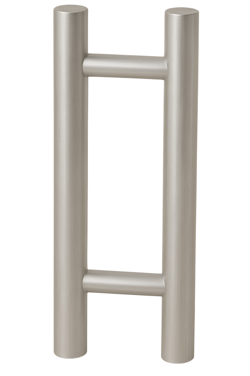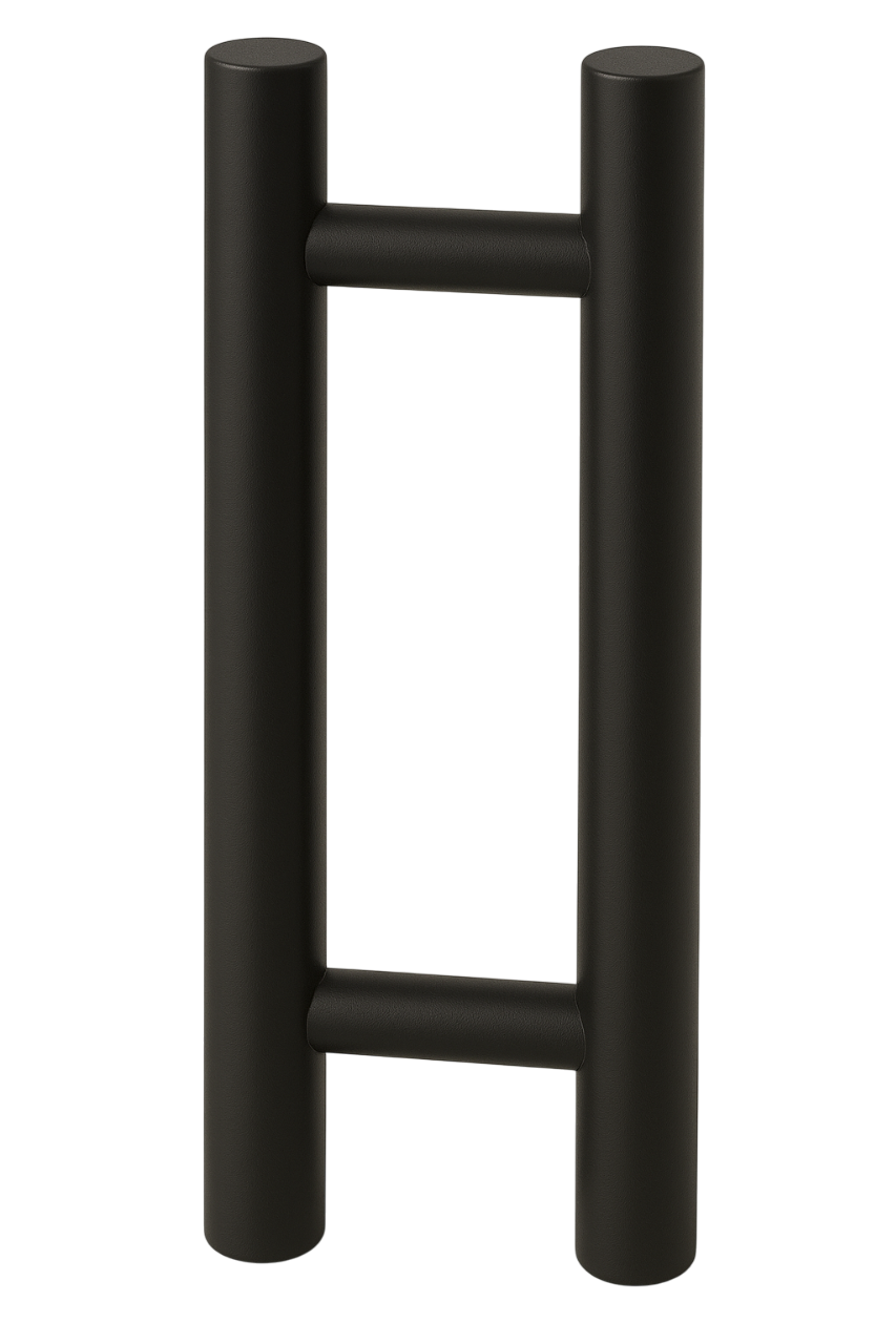 W ofercie dostępne są także uchwyty pionowe z zamkami w wersjach z pokrętłem od strony wewnętrznej lub z pokrętłem i kluczykiem od strony zewnętrznej – idealne do zastosowań w przestrzeniach komercyjnych, takich jak restauracje czy hotele. Wszystkie elementy wykonano w formie estetycznego odlewu bez widocznych śrub, co podkreśla minimalistyczny charakter i elegancję całego systemu.