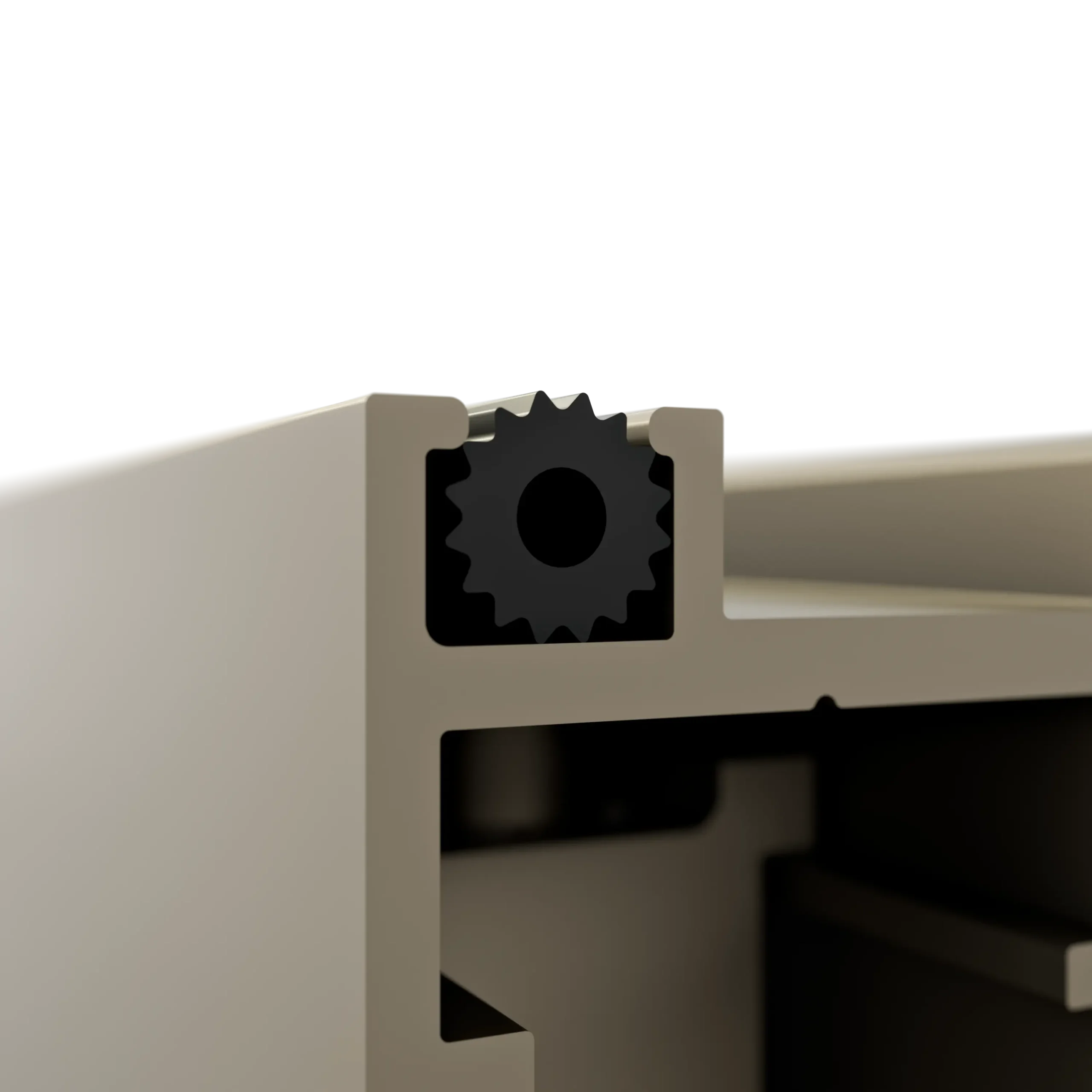 W systemie opracowano zamek dolny oparty na przekładni i mechanizmie zasuwki, co zapewnia lekką i funkcjonalną pracę. Widoczne pokrętło zamka malowane jest proszkowo i dostępne w kilku wariantach kolorystycznych, dzięki czemu element ten łączy niezawodność działania z estetyką dopasowaną do całej konstrukcji.