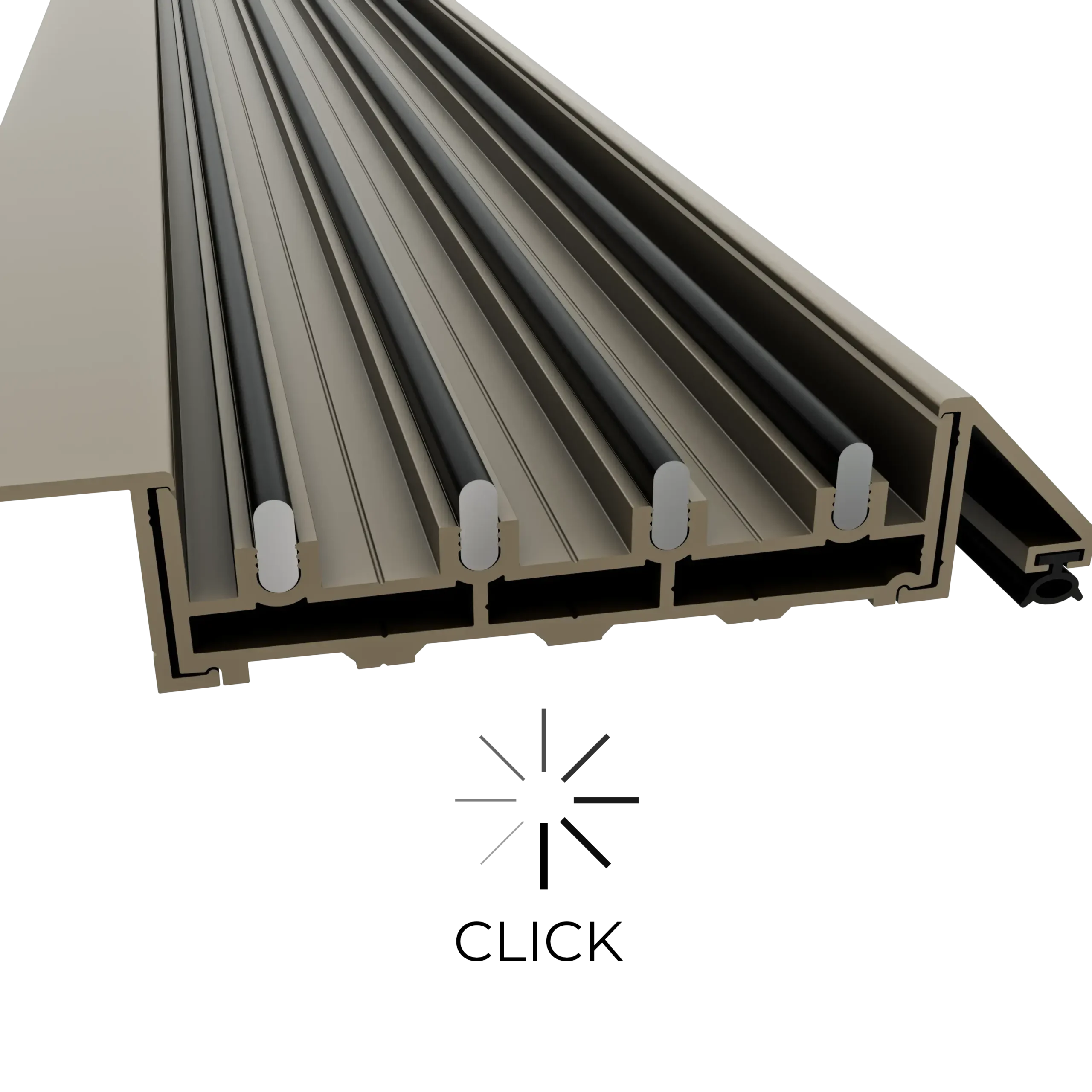 System WIN GLASS wyposażono w innowacyjne maskownice dolne montowane w technologii CLICK, co pozwala na szybki i precyzyjny montaż bez użycia dodatkowych wkrętów. Rozwiązanie to nie tylko skraca czas instalacji, ale także gwarantuje estetyczne wykończenie prowadnicy dolnej – bez widocznych punktów mocujących.