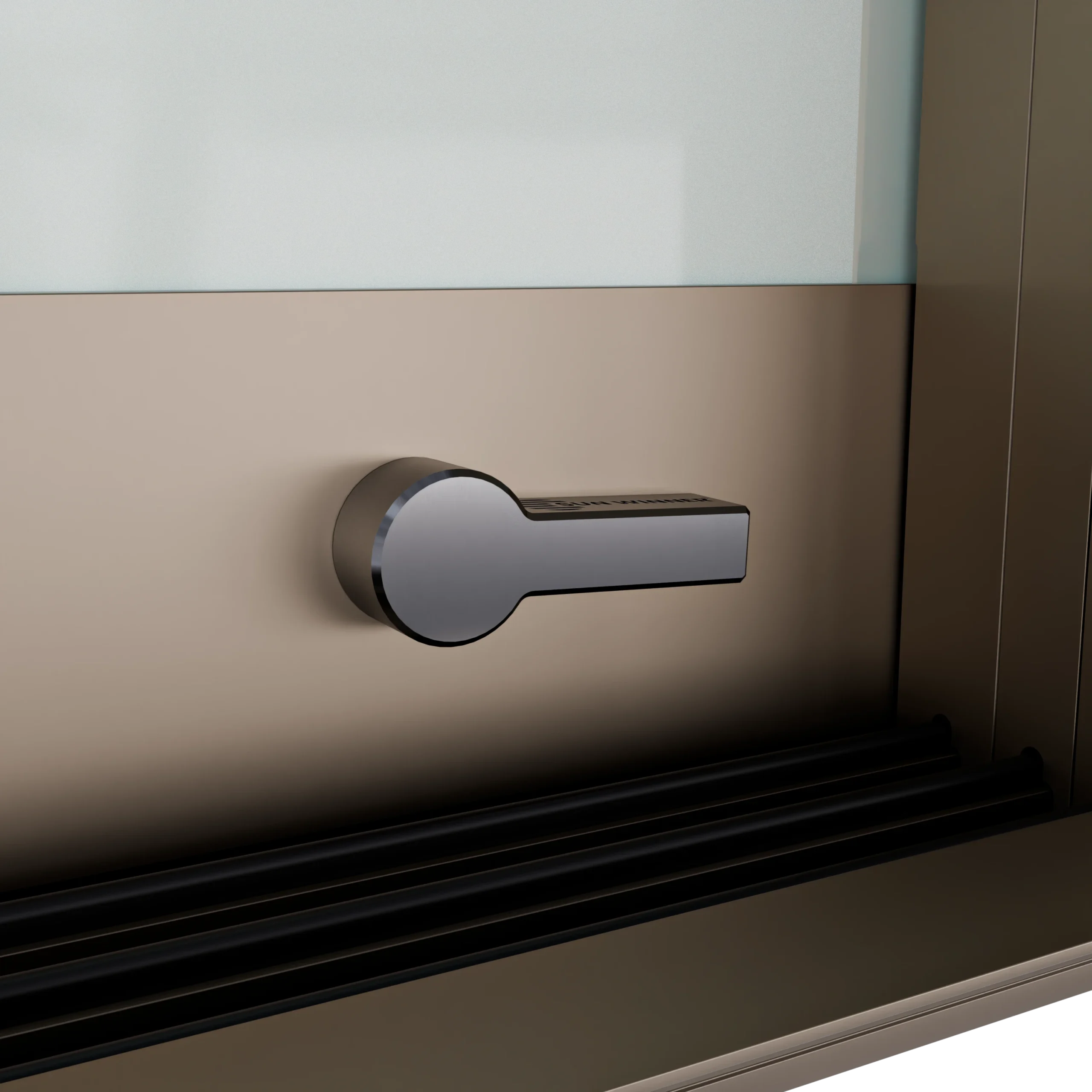 W systemie WIN GLASS zastosowano zamek dolny oparty na przekładni i mechanizmie zasuwki, który gwarantuje lekką, precyzyjną i niezawodną pracę całego systemu. Widoczne pokrętło zamka malowane proszkowo dostępne jest w kilku wariantach kolorystycznych, co pozwala dopasować jego wygląd do pozostałych elementów konstrukcji.