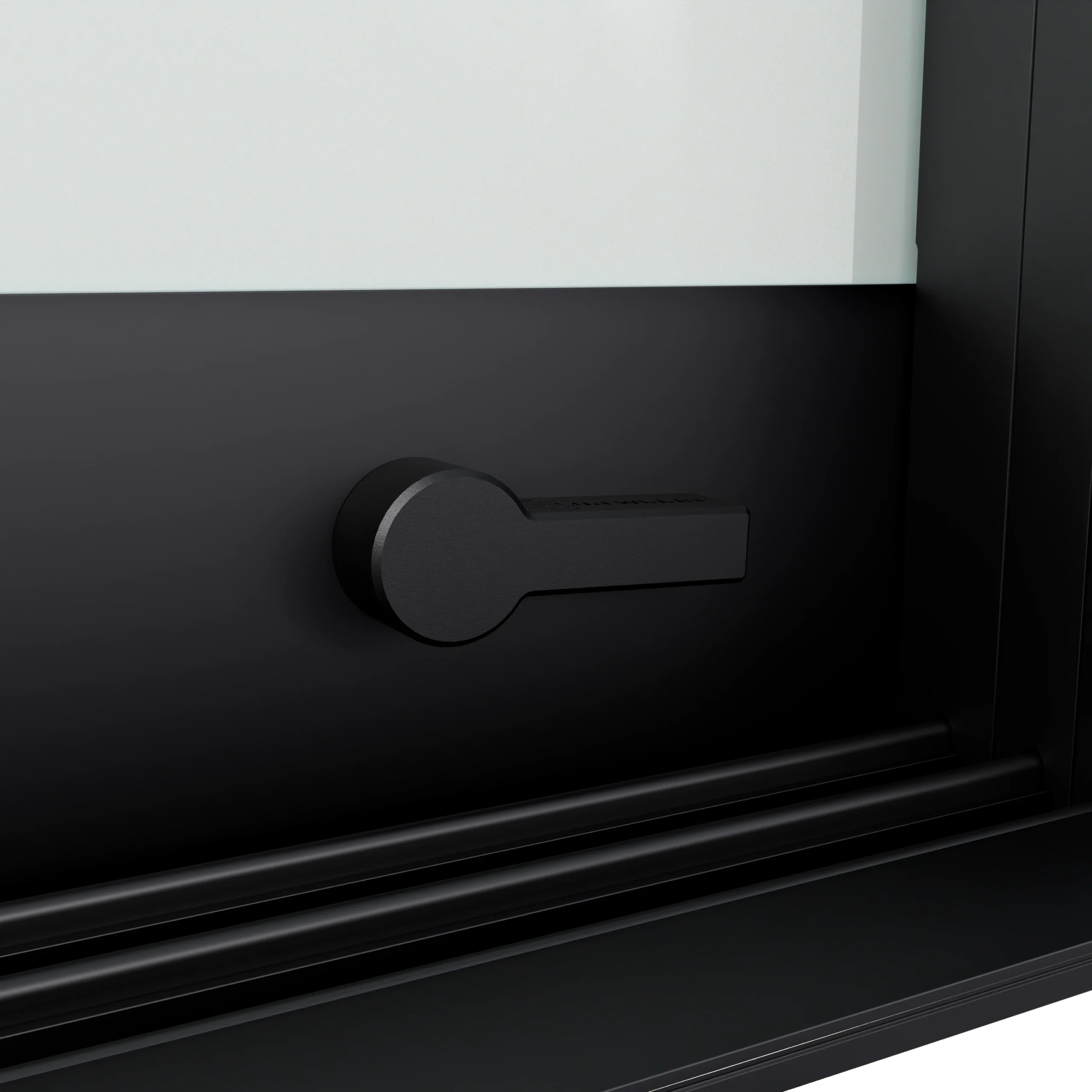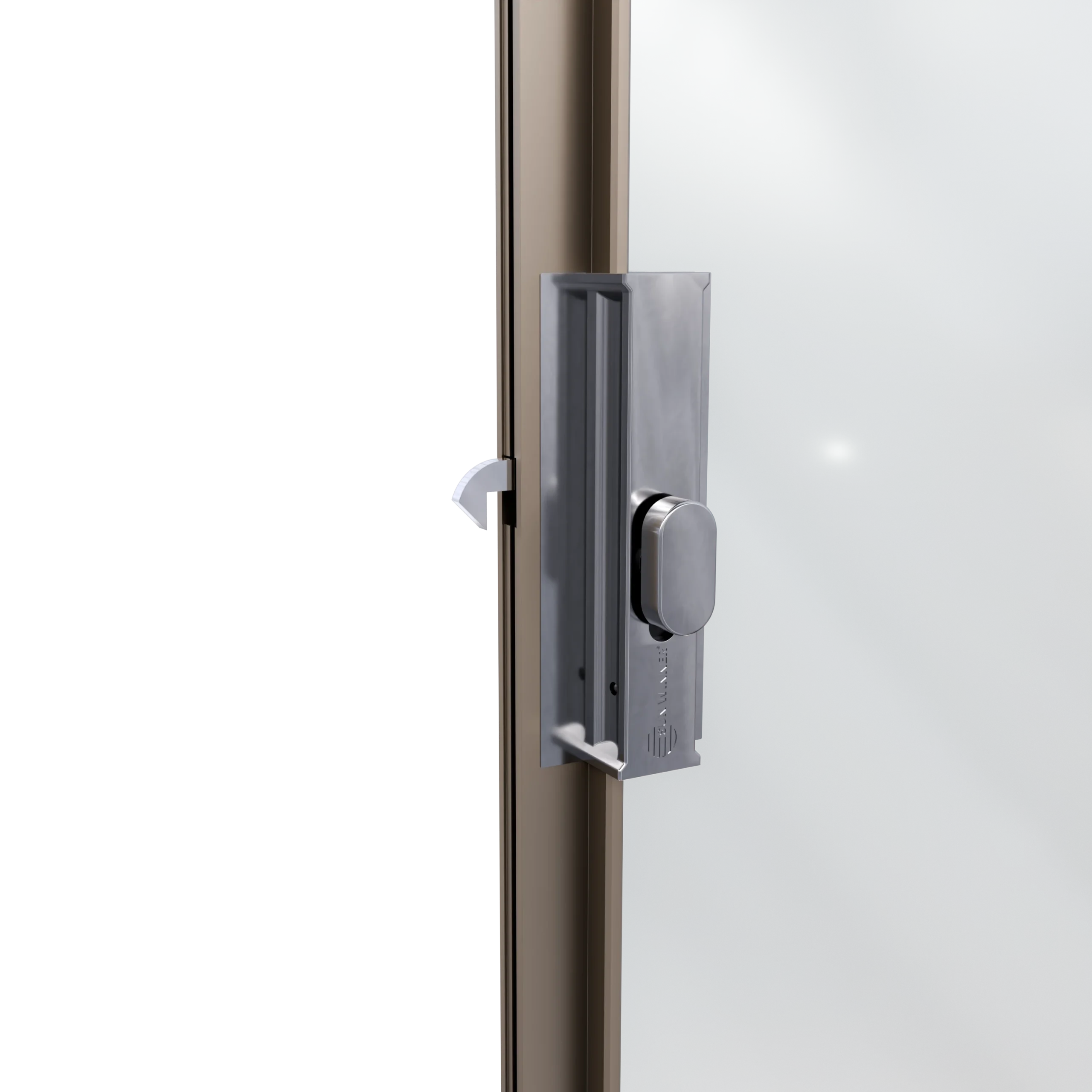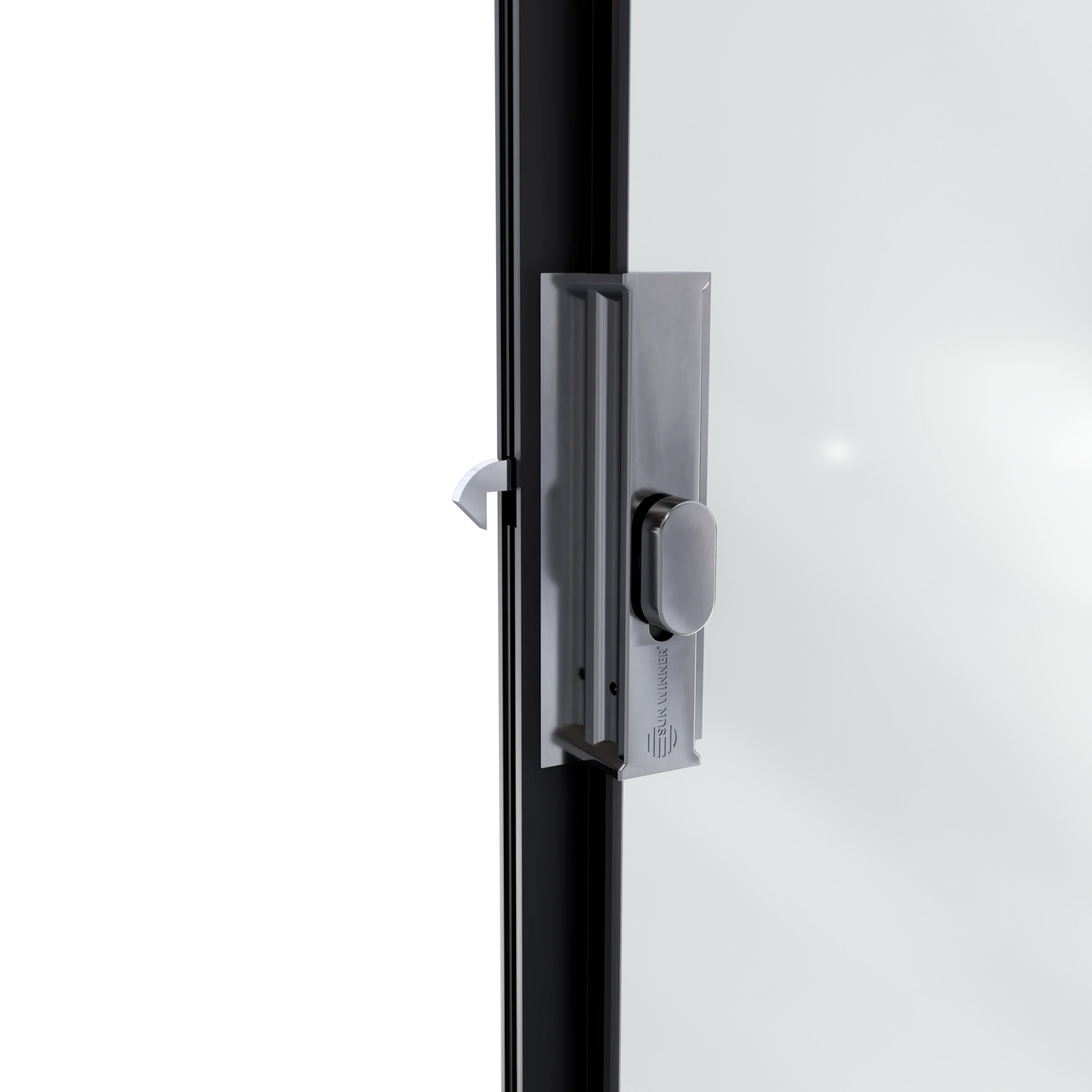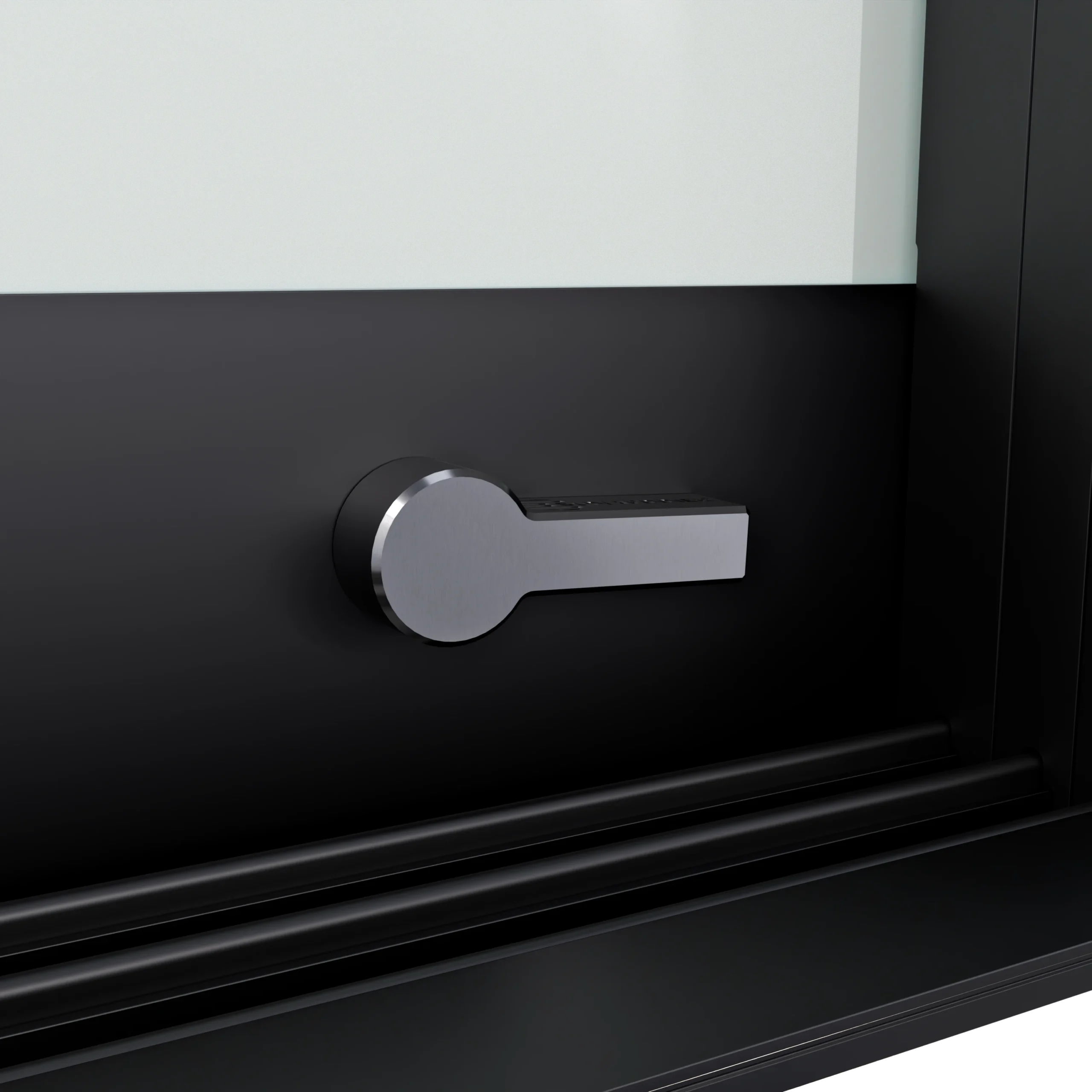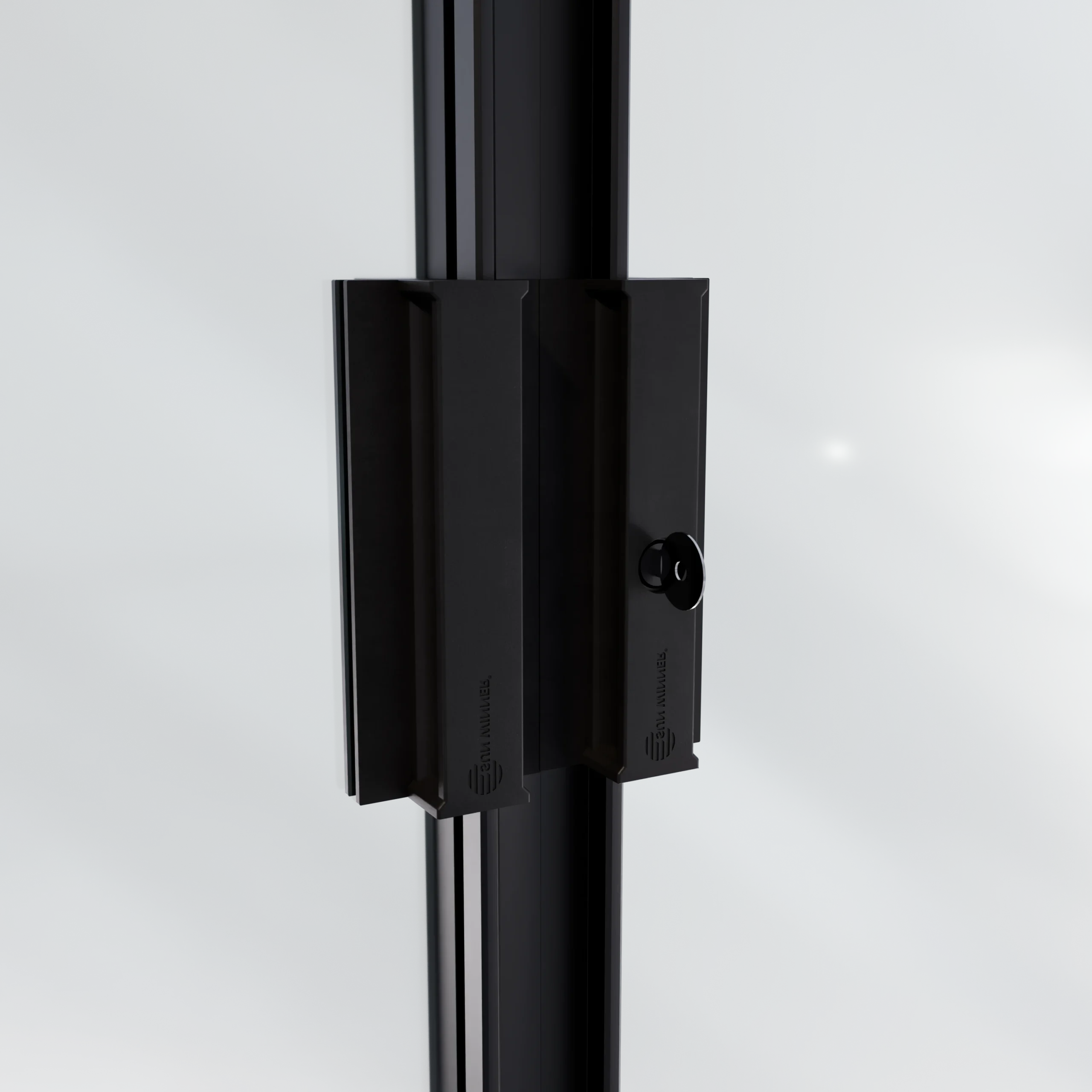 Do wariantu rozsuwania jednostronnego i dwustronnego przewidziano zamek górny z pokrętłem od strony wnętrza i kluczykiem od strony zewnętrznej. Występuje w dwóch kolorach – polerowana stal oraz czarny mat – spójnych z pochwytami. Został wykonany w formie odlewu, bez widocznych śrub łączących, co gwarantuje estetyczny wygląd i solidność.