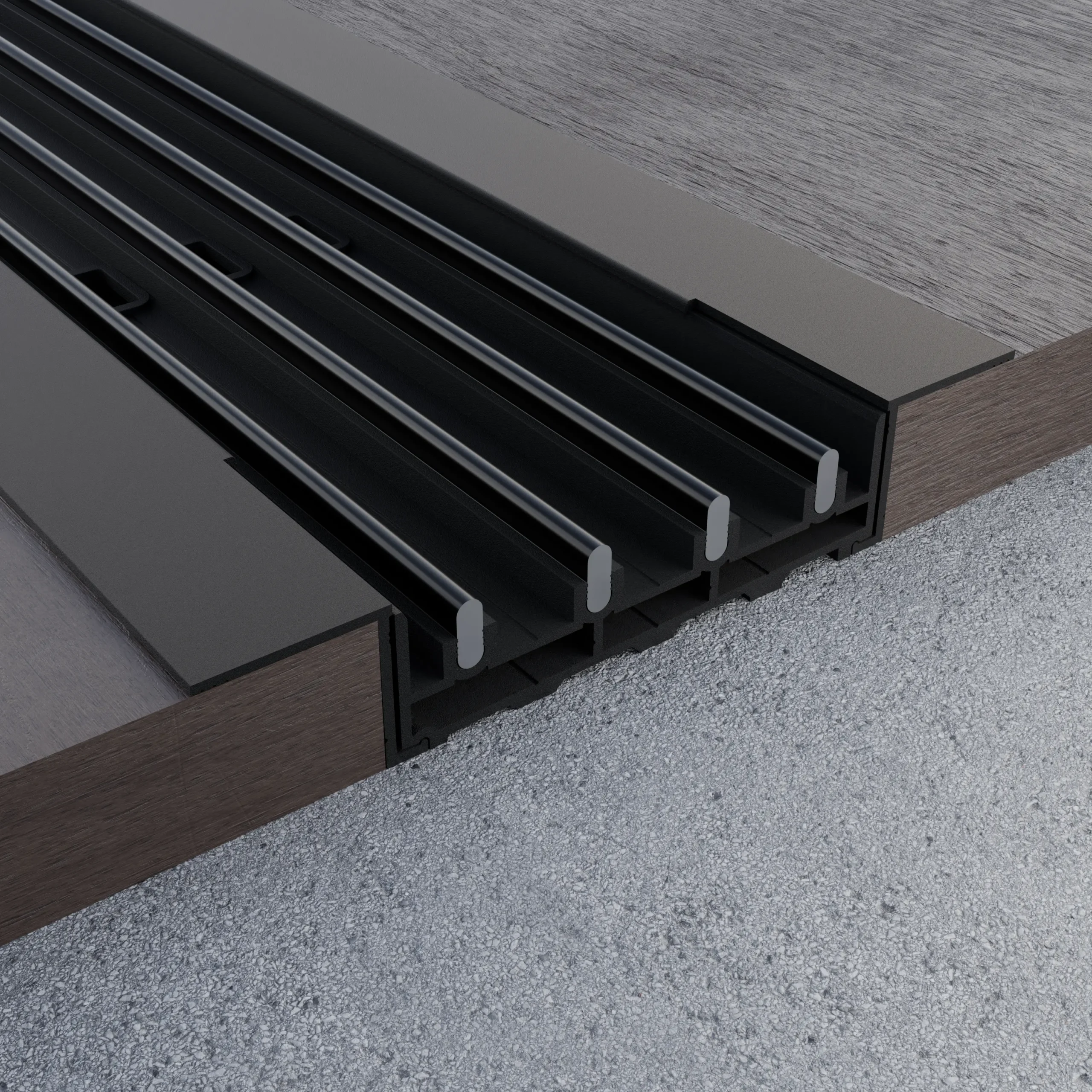Zastosowanie maskownic dolnych znacząco poprawia walory estetyczne paneli oraz chroni ich krawędzie przed uszkodzeniami mechanicznymi. System wyposażony jest w maskownicę wpuszczaną, która umożliwia montaż prowadnicy dolnej poniżej powierzchni podłogi – na przykład w desce tarasowej lub posadzce.